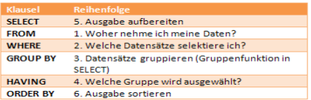 Bei einer SQL-Abfrage wird zuerst nachgesehen, von WO die Daten kommen (aus welchen Tabellen). Dies geschieht im FROM Teil der Abfrage. Im WHERE wird die Abfrage dann verfeinert und nur jene Ergebniszeilen zugelassen, die die Kriterien der WHERE Klausel erfüllen. Nach dem ersten Aussortieren, werden die Daten gruppiert (GROUP BY) und wieder verfeinert (HAVING). Als vorletztes wird nachgesehen WAS ausgegeben werden soll (SELECT) und zu guter Letzt in welcher Reihenfolge (ORDER BY).