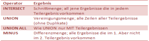 Mit Set-Operatoren wird das Ergebnis mehrerer Abfragen zu einem Ergebnis zusammengefasst. Der Operator bestimmt die Auswahl.
